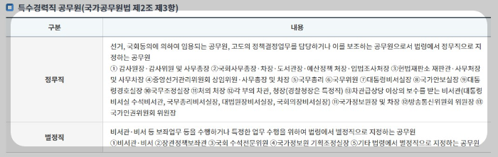공무원은 크게 경력직(국가공무원법 제2조 제2항)과 특수경력직(국가공무원법 제2조 제3항)으로 나뉘고